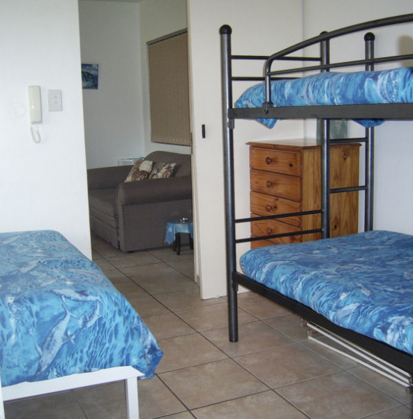 1st Floor Unit On the Beach, 1 bedroom, with 1 Double bed and 1 bunk bed, bathroom with shower. Well equipped kitchen & dining room with sleeper couch. Sea view on side of complex. Communal braai downstairs & carport parking.